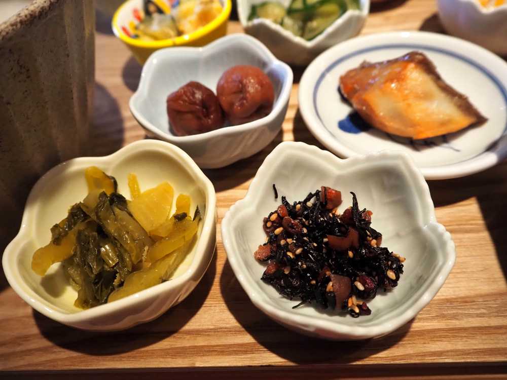お粥に梅ひじきを入れると、味変が出来る上に綺麗なピンク色になりました。みりん干しのお魚も優しい味付けで美味。全体的に薄味のお料理が多くてヘルシーなのに、お腹もいっぱいになれて、大満足な内容でした。