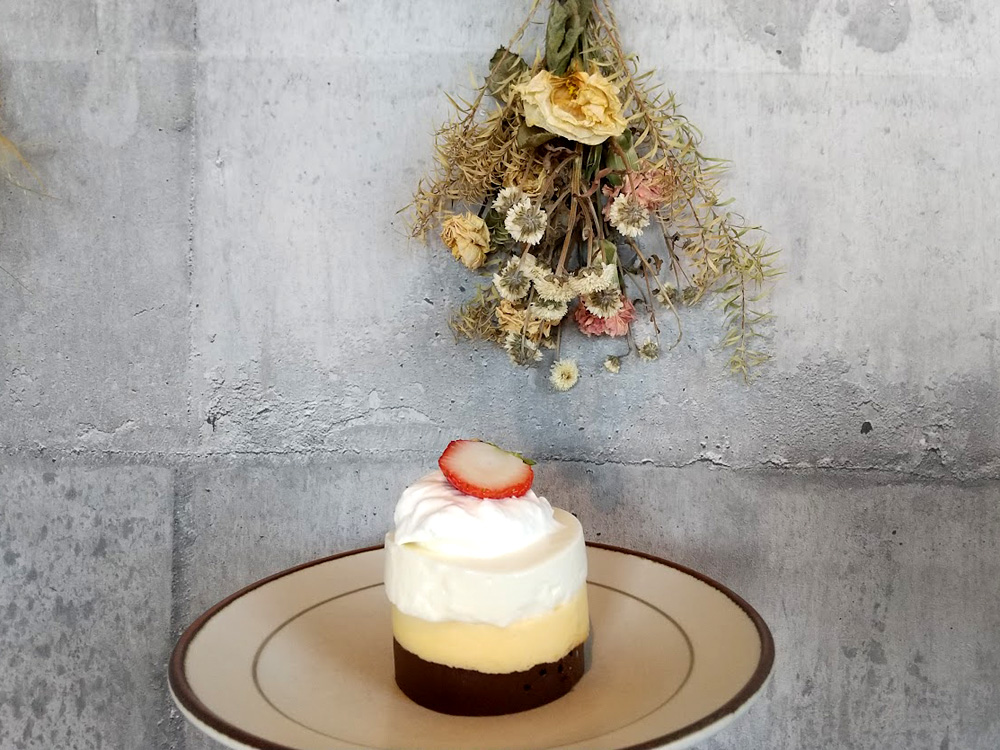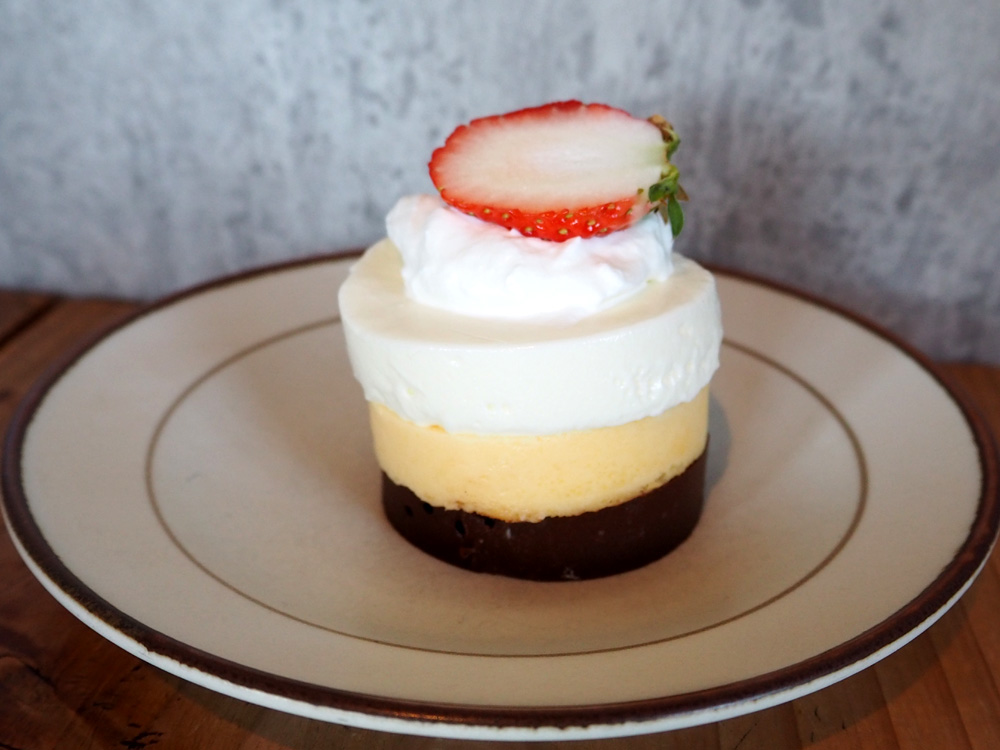 見た目も可愛くて気分上がりまくりなケーキは、レアチーズケーキ、ベイクドチーズケーキ、ガトーショコラの層が美しかったです。どのケーキ部分も、甘さ控えめな軽い食感で美味。炙りか旬のフルーツかを選べ、炙りにすると目の前でバーナーで炙ってくれますよ。