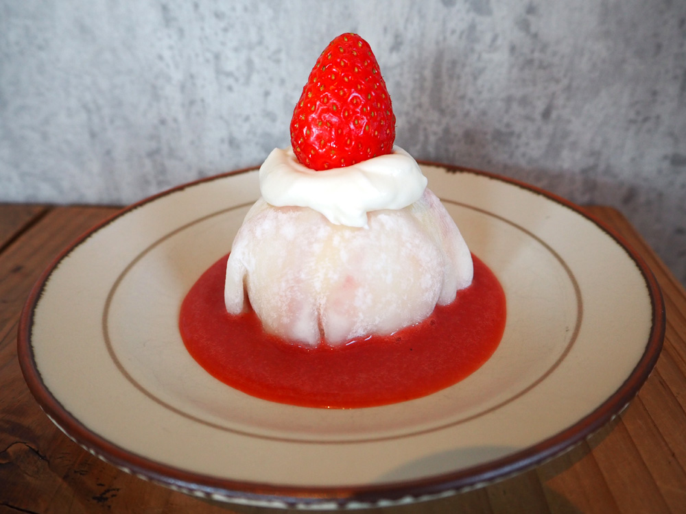 3/31迄の期間限定メニューは、モチモチの求肥の中に、バニラアイス、自家製チーズクリームが入ってます。周りのいちごソースも甘すぎず程よい酸味でとても美味しかったです。カフェラテの入ったトルネード状のグラスも可愛いですよね。
