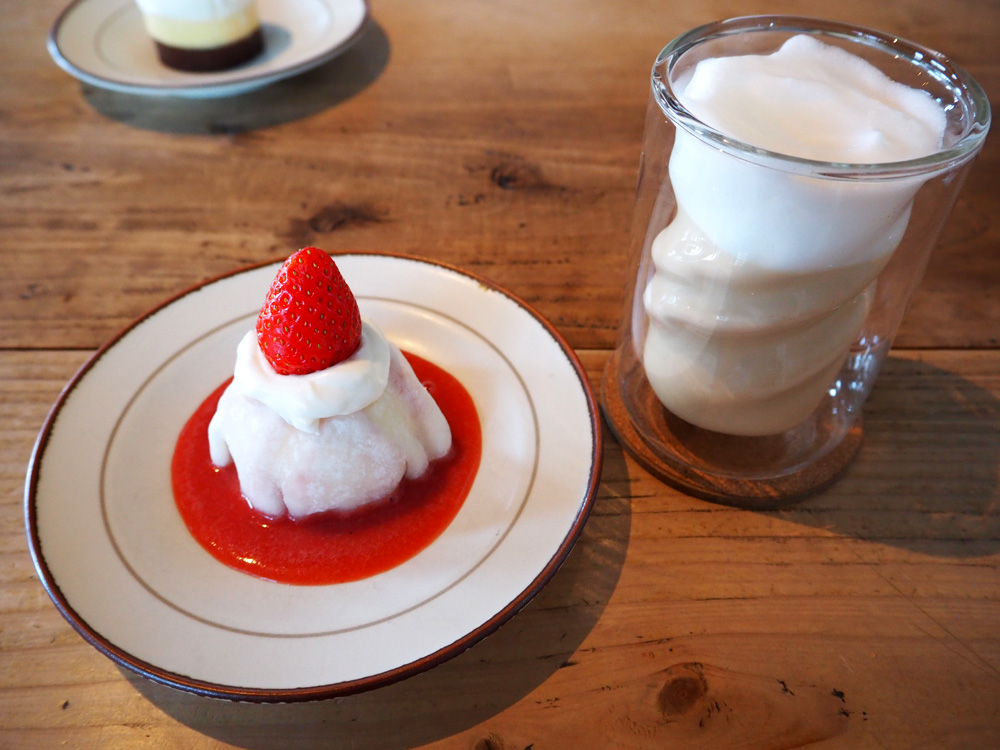 苺大福とチーズのケーキ¥660、カフェラテ¥660