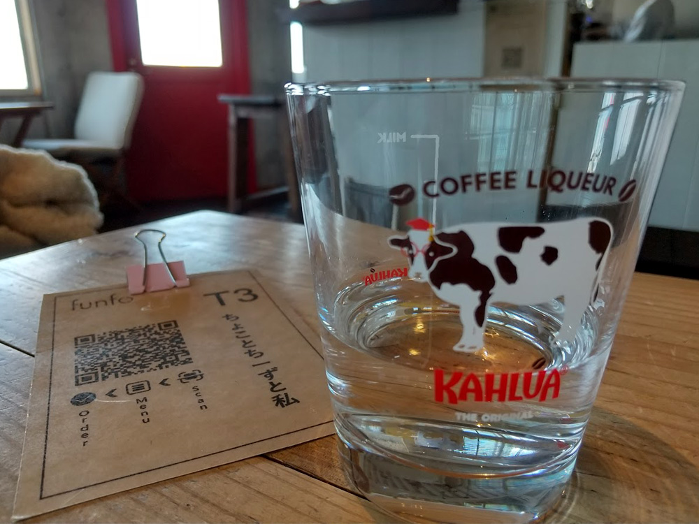 階段の上には小上がり席もありました。注文はQRコードから行う方式です。セルフサービスのレモン水も美味しかったし、牛さんのグラスもキュートでした。