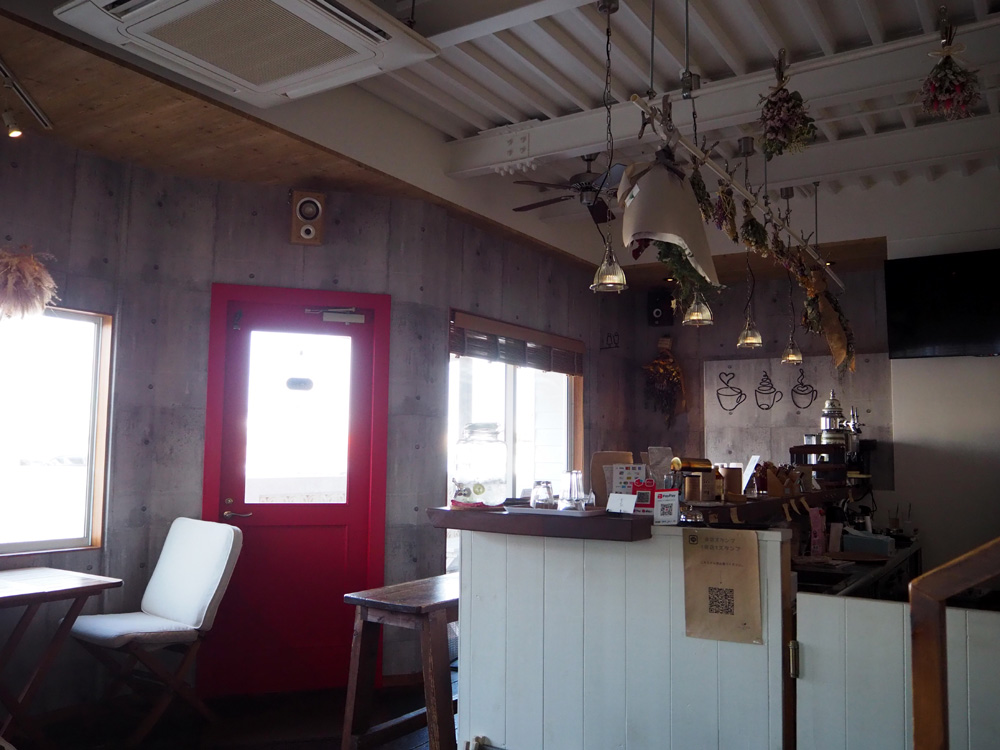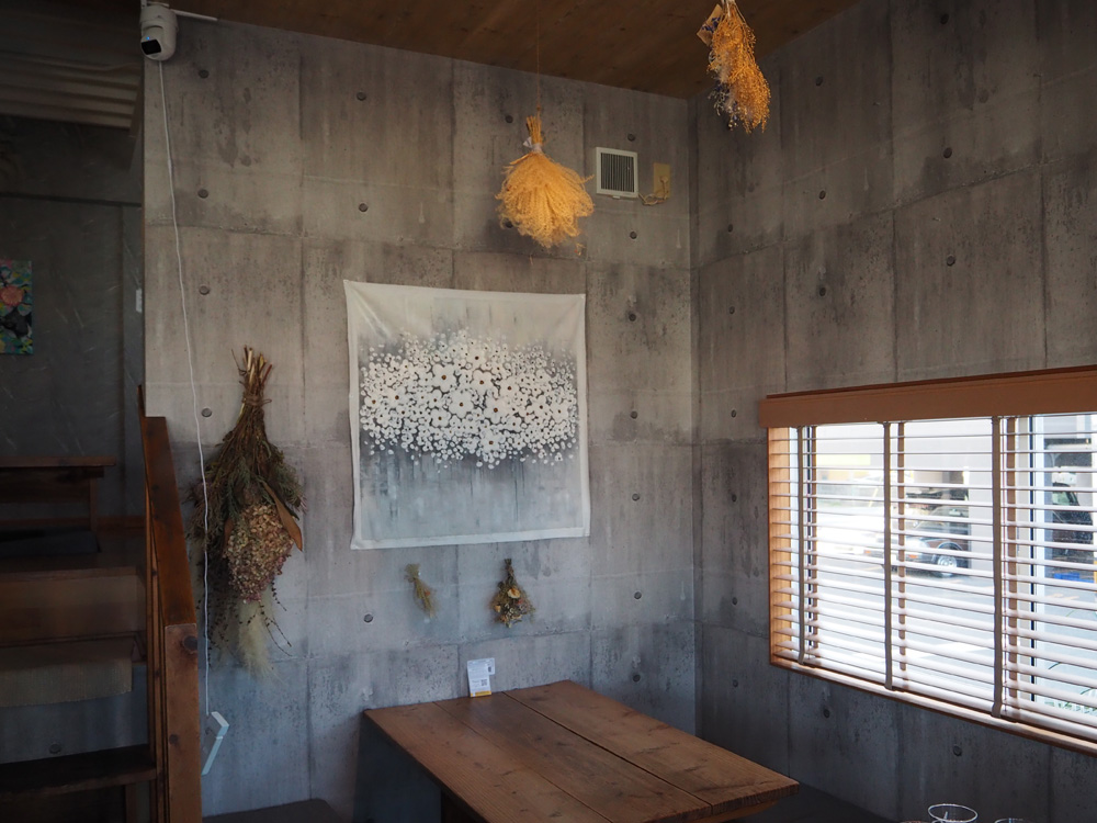 無機質な内装にドライフラワーやイラストがお洒落に飾られてました。カウンターでは、コーヒーやグッズなども販売されてましたよ。