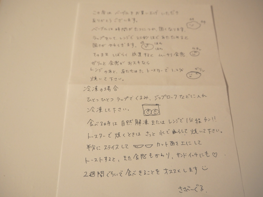 プレーンは、生地のもっちり感が楽しめますよ。焼き戻し方法が書かれた説明書にもほっこり♪