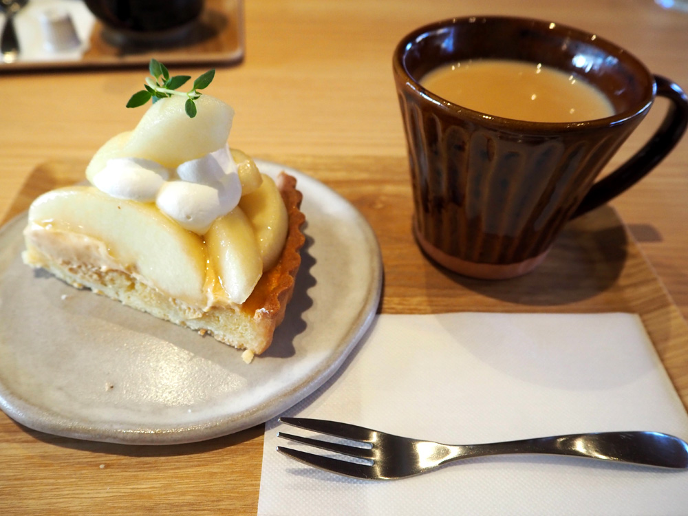 タルトと一緒にドリンクを選べる「タルトセット」は、上の段のタルトと下の段のタルトで値段が変わります。洋梨のタルトは下の段で、セットは1,200円でした。甘くて瑞々しい洋梨とちょっぴりほろ苦いキャラメルクリームの組合わせが最高でした。サクサクだけど硬すぎないタルト生地も美味しかったです。