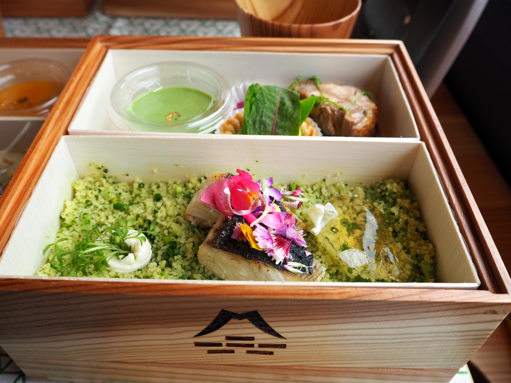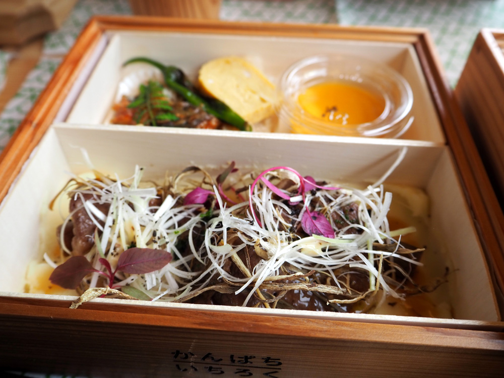 12:19に博多駅を発車してすぐに、日田杉を使用した二段重に入ったお食事が提供されます。土曜は福岡市博多区に店舗がある「FUCHIGAMI」が提供されるイタリアンでした。ロゴマーク入りのテーブルクロスは持ち帰れますよ。飲み物は有料でお水などは出されないので、乗車前に購入されることをオススメします。