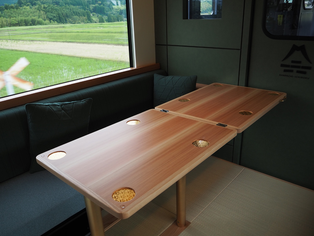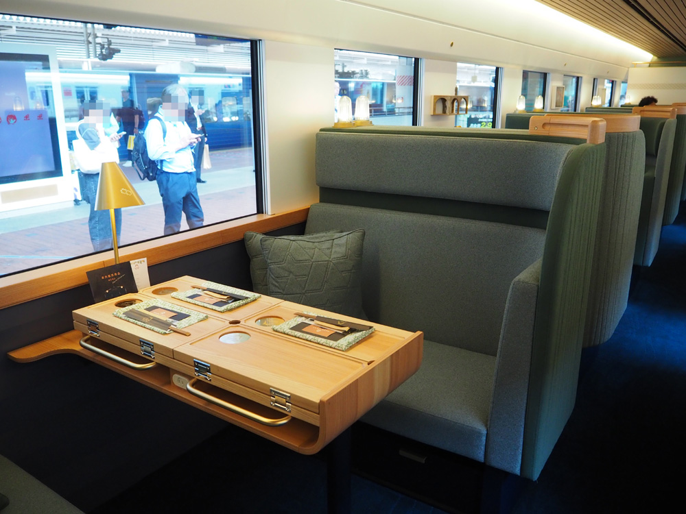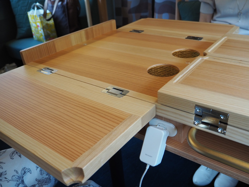 1号車は、3名まで利用可能なソファ席と、畳個室、半個室がありました。杉のテーブルは食事の時は開いて使います。コンセントも各席にありましたよ。