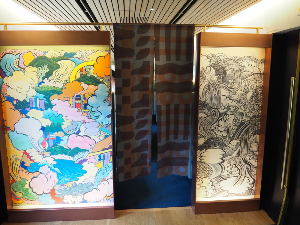 畳個室には靴を脱いで上がります。4名以上のグループでの利用には快適かも。食事の際は、向かい側にあるソファ席が動いて、テーブルまで近づくとの説明にビックリ!いつか機会があったら、個室も利用してみたいなと思いました。3号車入口の暖簾が銭湯っぽかったです。