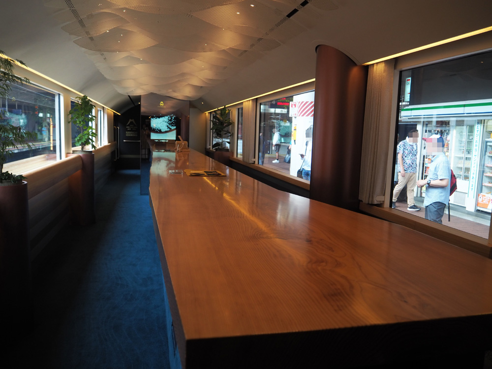 樹齢約250年の杉を用いた1枚板のカウンターが素敵な2号車では、飲み物やオリジナルグッズ等の購入が出来ます。他に比べて2号車はかなり揺れるなと思いました。
