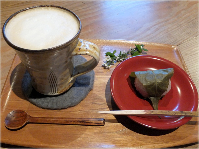 カフェオレと季節の生菓子のセットです。桜葉の香りが上品な桜餅は、厳木町の『草生庵(そうしょうあん)』製とのこと。日によってはお店で買うことも出来るそうですが、基本的には和菓子のみの販売はされてないとのことです。