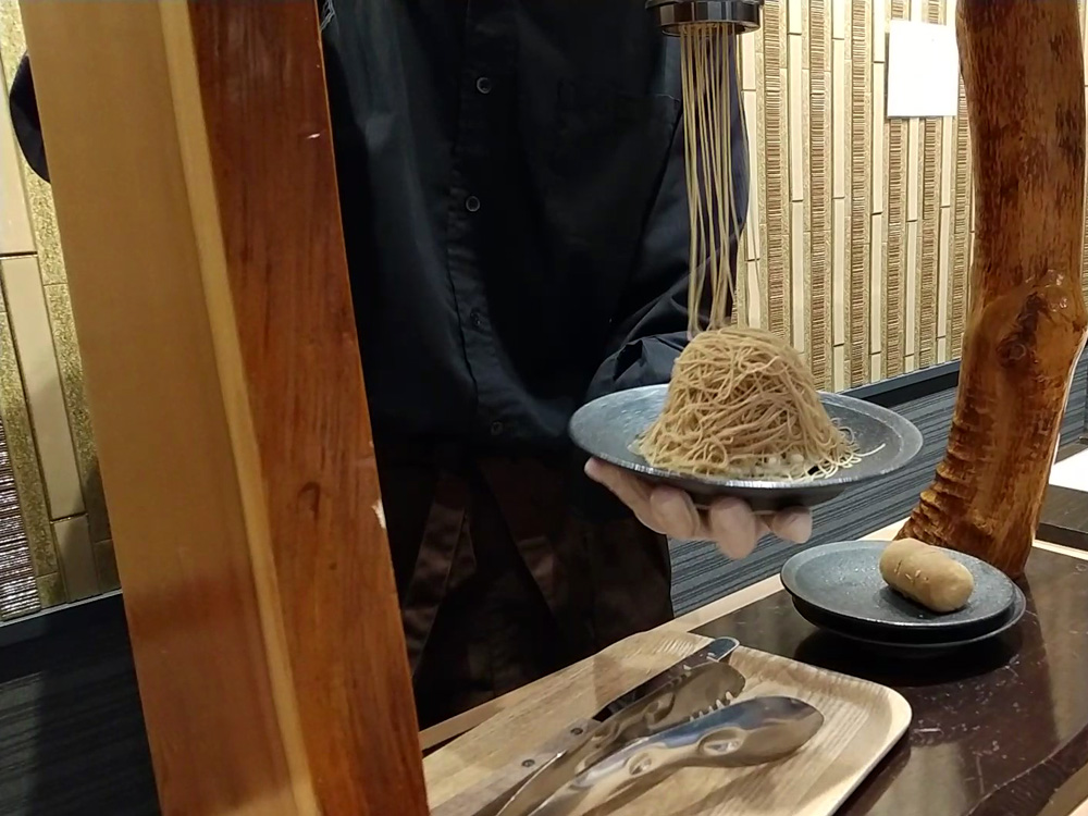 大名にある、目の前で栗クリームを絞るパフォーマンスが見られて人気の和栗モンブランの専門店です。こちらは「五感で楽しむモンブラン」がコンセプトで、ドーム型の器を開けると栗の香りが広がるサービスなど、エンタメ要素がたくさんあって楽しかったです。