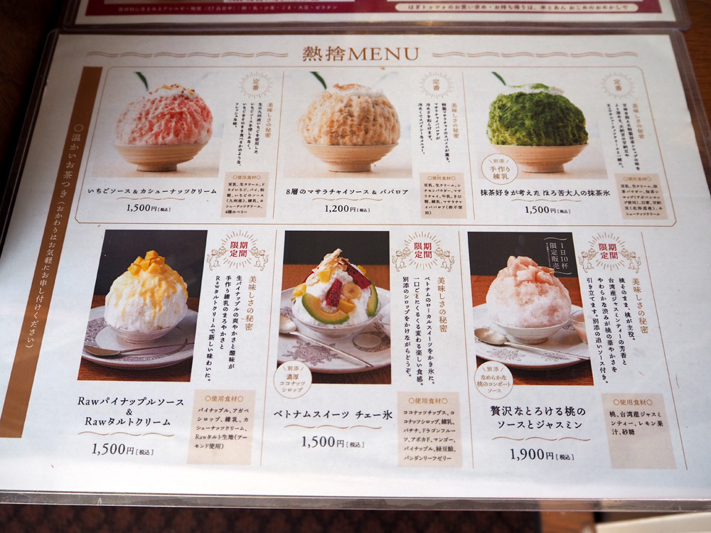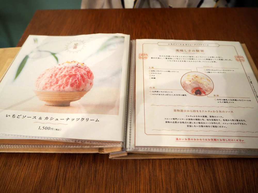 メニュー表の1ページ目には、かき氷の食べ方に関する注意点が書かれてました。こちらのかき氷の為に作られた器やスプーンも素敵ですよね。食べ終わった頃に、温かいお茶が提供されたのがすごく嬉しかったです。