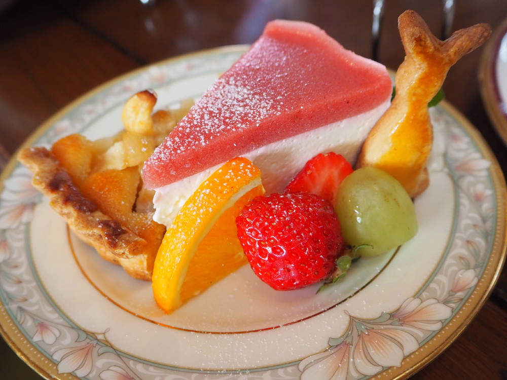 こちらのアフタヌーンティーセットで一番嬉しかったポイントは、好きなケーキを2種類も選べたことです。可愛いクッキーとフルーツも添えられていて大満足でした。「いちごのレアチーズケーキ」は甘酸っぱいイチゴと、レアチーズの爽やかな酸味のバランスが絶妙で美味しかったです。「ベイクドチーズケーキ」「りんごとナッツのタルト」の他に、グルテンフリーの「チョコレートケーキ」もありましたよ。
