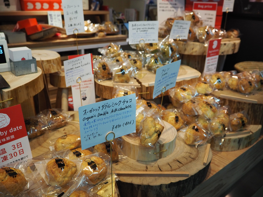 スコーンが並べられた丸太の輪切りもお洒落ですよね。この日は1人6個までの購入制限がありましたよ。