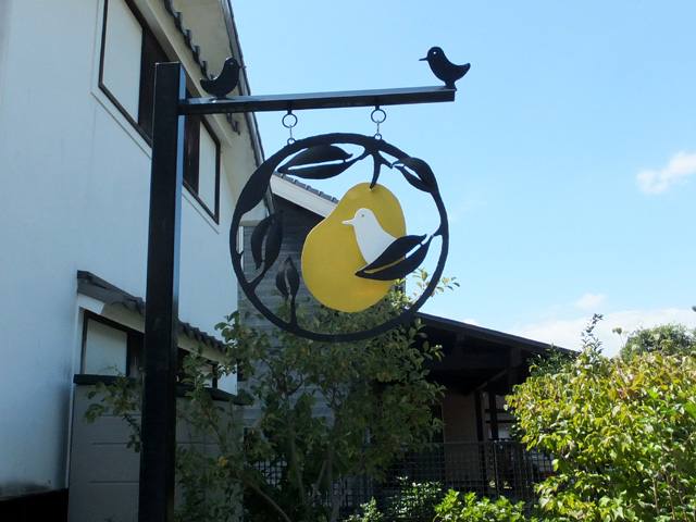 鳥モチーフの看板が可愛いです。お店の奥にはテラス席もあり、パンをこちらで頂くことも可能です。高山珈琲のコーヒーも店内で購入できますよ。