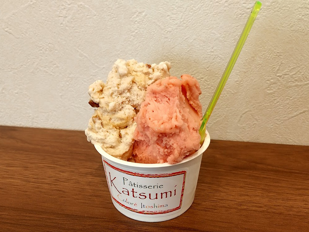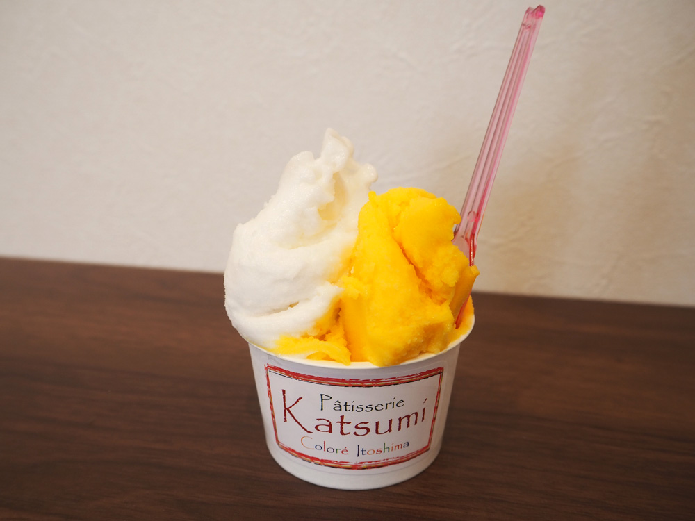 糸島店のみで販売されているパティシエがつくるジェラートは、店内のイートインスペースで頂くことが出来ますよ。7種類ほどあったジェラートは、1種類のシングルでも2種類選べるハーフ&ハーフでも同じ値段という嬉しさ♪「糸島レモン」には、自家製レモンピールがたっぷり!ハチミツも入っているので、思っていたほどの酸味はなく食べやすかったです。「あまおういちご」は苺のつぶつぶ感が活きてます。キャラメリゼしたアーモンドがたっぷり入った「プラリネアーモンド」も美味。