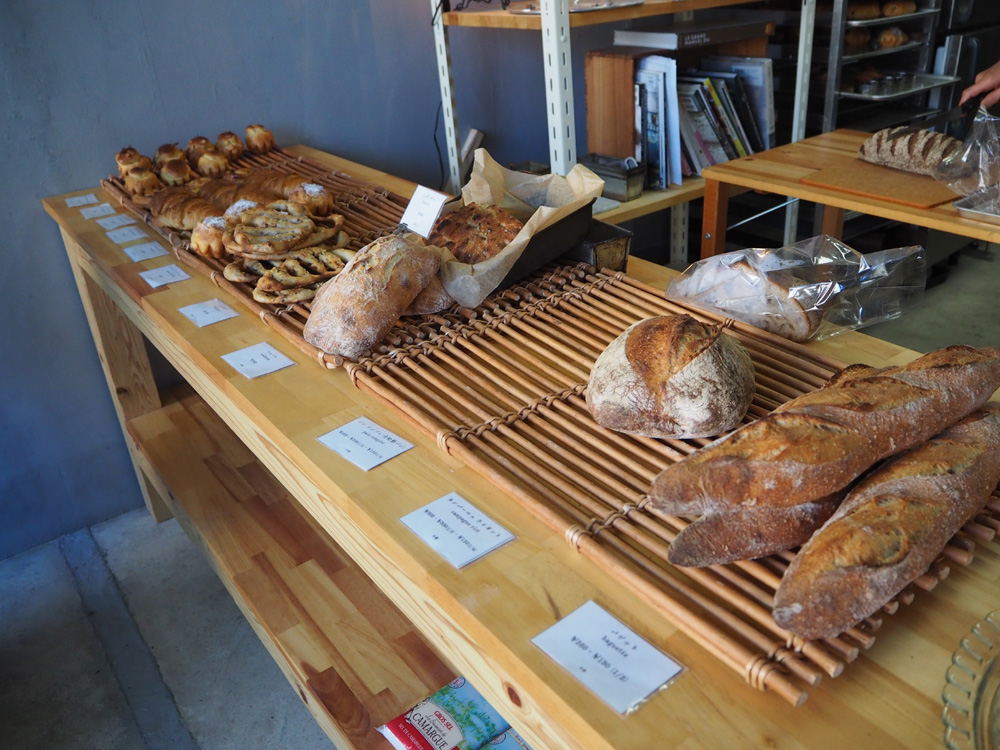小戸の住宅街に8月にオープンした、自家製酵母を使用したパンが美味しいと評判のパン屋さん。ヘアーサロンだった面影があちこちに残る建物の外観は、パン屋さんには見えず思わず通り過ぎそうになりました。店内には10種類程のパンが並んでいて、お店の方に欲しいパンを取ってもらう対面販売方式です。オープンと同時に次々にお客さんが来られていて、オーナーさんお1人での接客がとても大変そうでした。(そんなお忙しい中、写真撮影の許可を快諾していただき、ありがとうございましたm(_ _)m。)