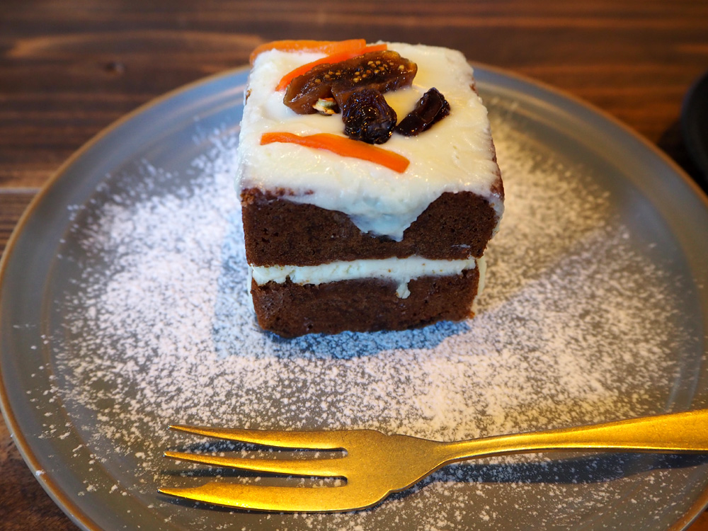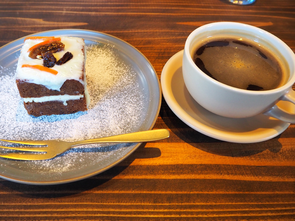細切りのにんじんがふんだんに入ったキャロットケーキには、レーズンやナッツなどもたっぷり入ってます。スパイスが効いた大人味のケーキで、中深煎りのハンドドリップコーヒー(¥660)にとても良く合いましたよ。