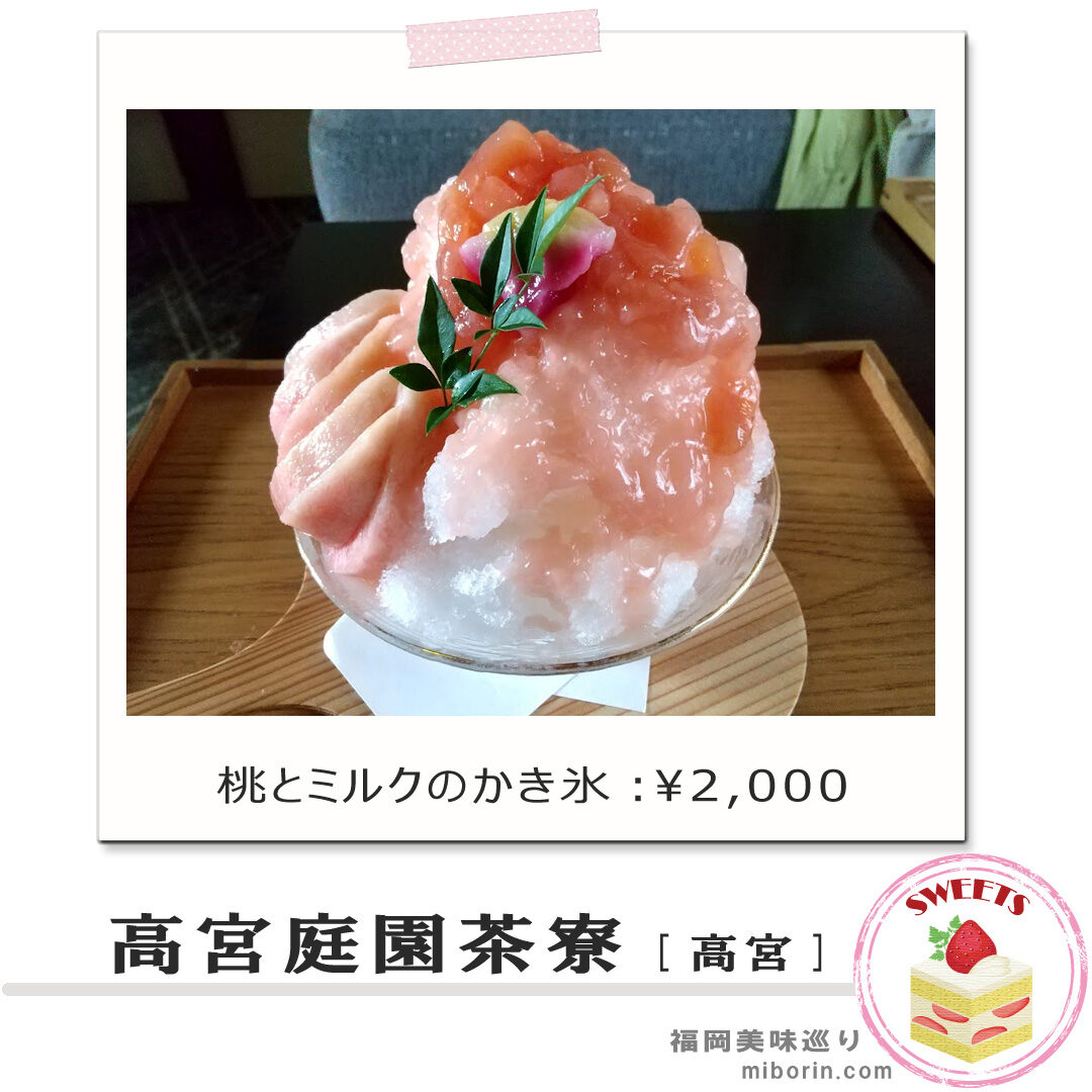 西鉄・高宮駅から徒歩約5分の場所にある「高宮庭園茶寮」で、期間限定で提供される和テイストのかき氷です。こちらは、歴史的建造物「旧高宮貝島家住宅」内にあり、手入れの行き届いた日本庭園を眺めながら、美味しいかき氷を頂くことが出来ます。かき氷は大変人気で、お店のHPからの事前予約が必須ですよ。