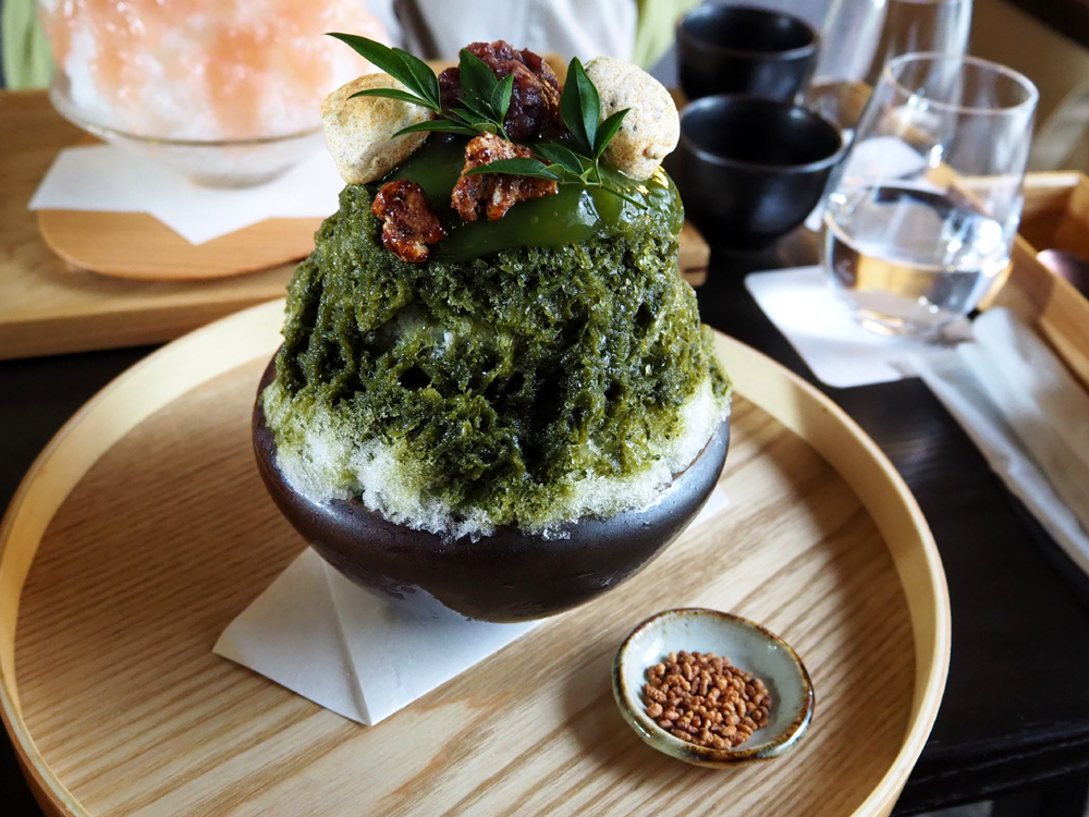 こちらは、9月30日(火)まで提供される八女抹茶づくしのかき氷です。氷にかかっているのは、抹茶のわらび餅ソース、自家製餡子、黒胡麻きな粉のメレンゲ、クルミのキャラメリゼなどです。中にも抹茶のパンナコッタが入っていて、抹茶の濃厚な美味しさが堪能できるかき氷でした。別添えの玄米をかけると味変も楽しめますよ。