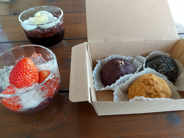 お目当てのおはぎは手のひらサイズで可愛いく、手土産にもピッタリだと思います。北海道産小豆を使用した自家製あんこは、優しい甘さでどれも美味しかったです。5個入り(¥750)もありましたよ。(あずき、きなこ、黒ごまの種類や組み合わせは選べません。)