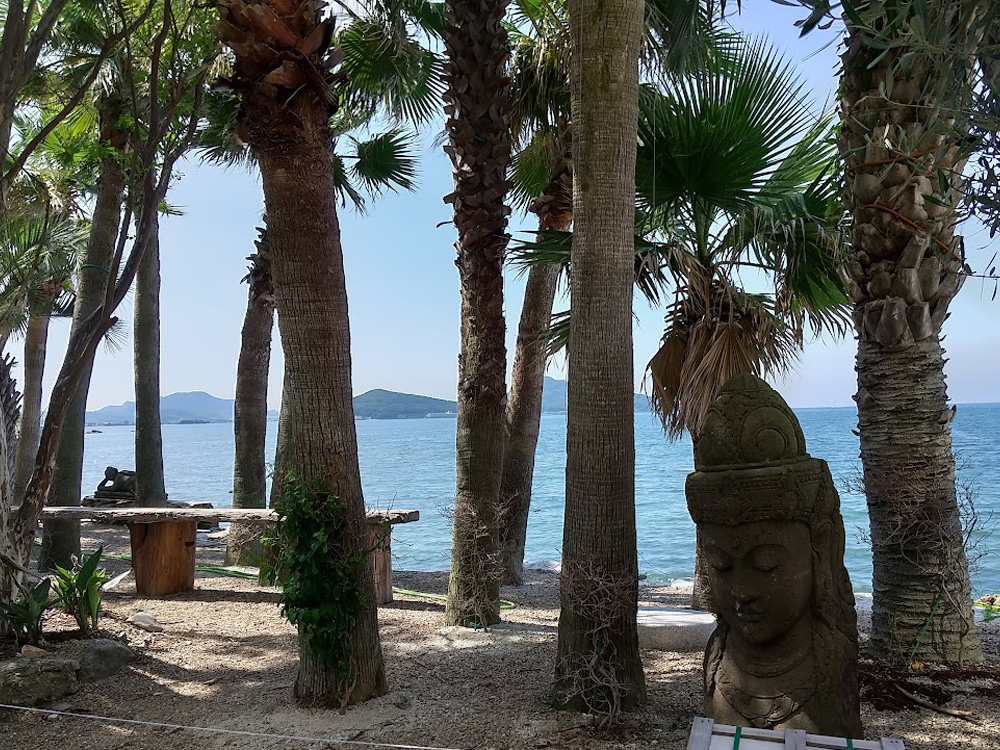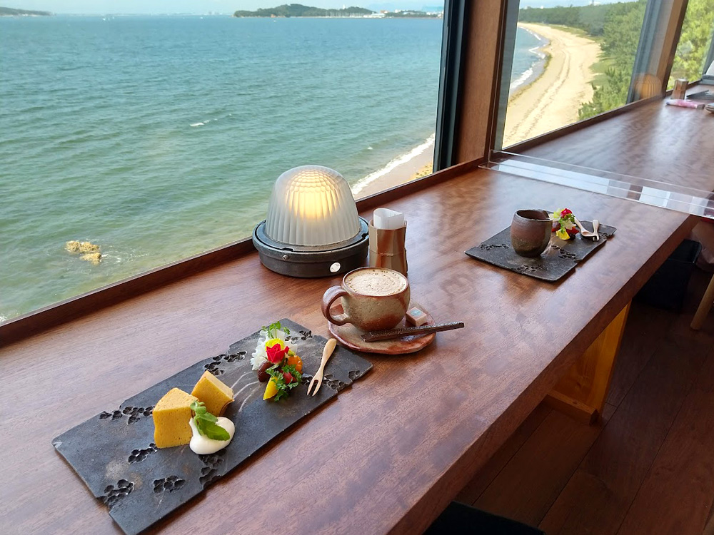 生の松原海岸の目の前にオープンした「生之松原測候所」内にある絶景カフェ。アジアンテイスト溢れる敷地内にある白い建物は、1・2階が森山銘木のギャラリー、3階がカフェになってます。海が眺められる人気のカウンター席は、11:30~14:00のランチタイムはランチ利用の方優先の席になるそうです。