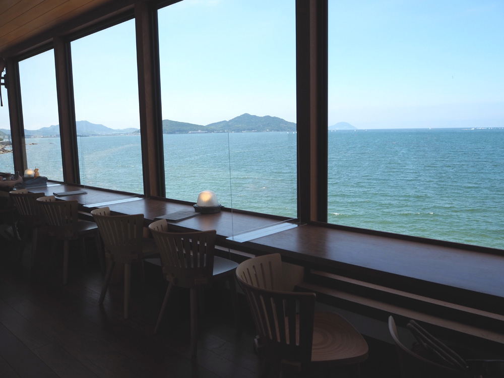 カウンター席からは青い海越しに能古島や志賀島などが眺められますよ。