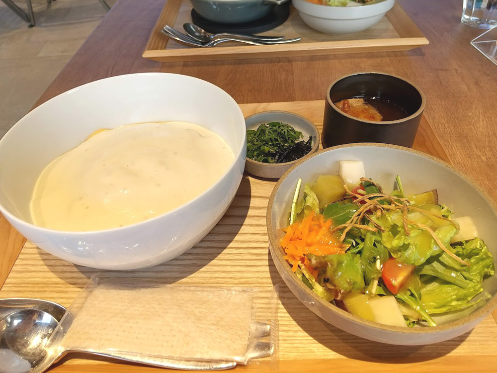 泡状でフワフワトロトロなヴィシソワーズソースの下には、めんたいソースが絡んだ生パスタが隠れてます。別添えの海苔や大葉で味変も楽しめますよ。オニオングラタンスープも味が濃いめなので、セットはコーヒーにすれば良かったなと思いました。